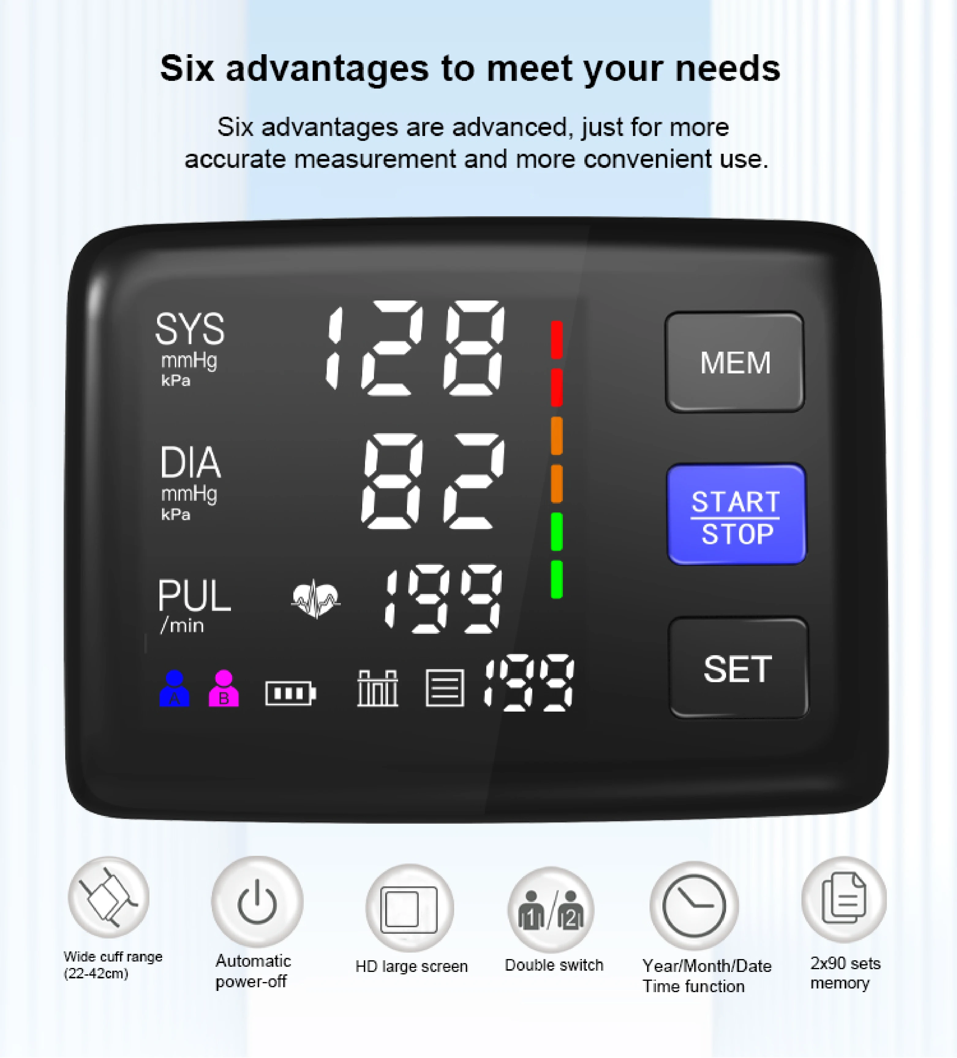 Pressure:0-299mmHg Pulse:40-199 pulses/min |