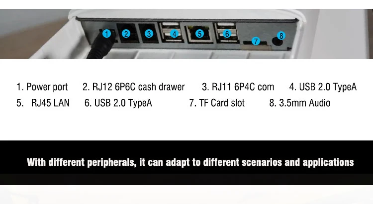 Ports | 1* SIM Card slot(optional) 1* RJ12 6P6C cash drawer |