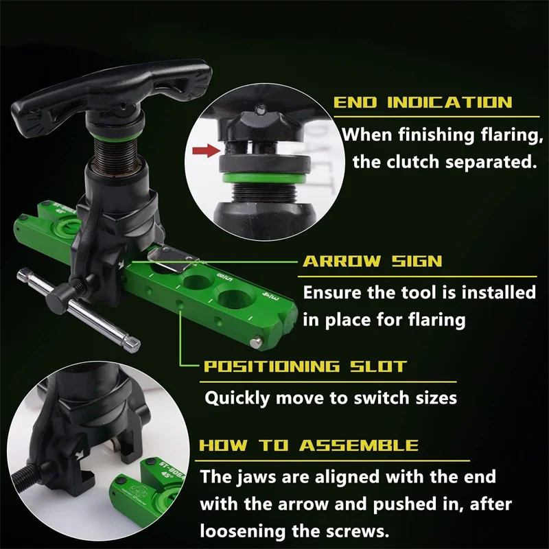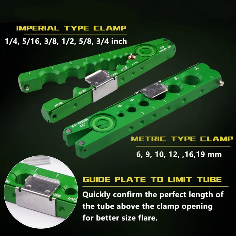 Flaring Tool: Only for single flare, 45° eccentric type cone design makes it easier to produce a smooth quality flare without leak. Equipped with 2 Clamps, compatible with 1/4", 5/16", 3/8 ", 1/2", 5/8 ", 3/4", 6mm, 9mm, 10mm, 12mm, 16mm and 19mm (O.D.) tubes. Suitable for the soft copper, brass, aluminum, mild steel tubes, air heaters, refrigerator, air conditioners, HVAC, electrical products, etc. (Not suitable for super soft aluminum) |