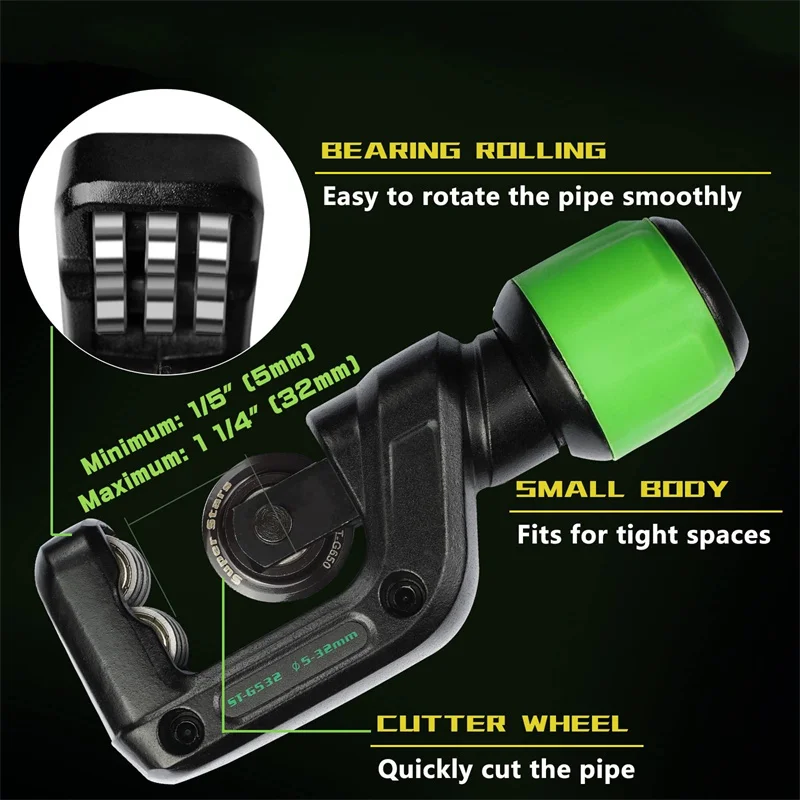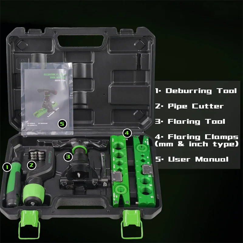 5PCS Set: Includes Eccentric Single Flaring Tool, 2 Flaring Clamps(Metric & Imperial types), Pipe Cutter(for 5-32mm or 1/5'' to 1 1/4'' tubes), Deburrer and Manual, all in a nice storage case. |